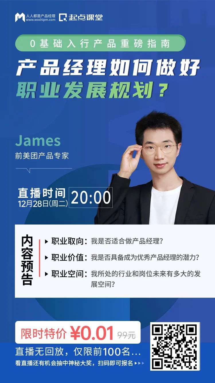 我们特邀前美团产品专家@James授课,来跟大家讲解如何做好系统而专业的产品经理职业发展规划,以帮助新人们更好地认识自己和产品岗,规划好自己的产品进阶路线。