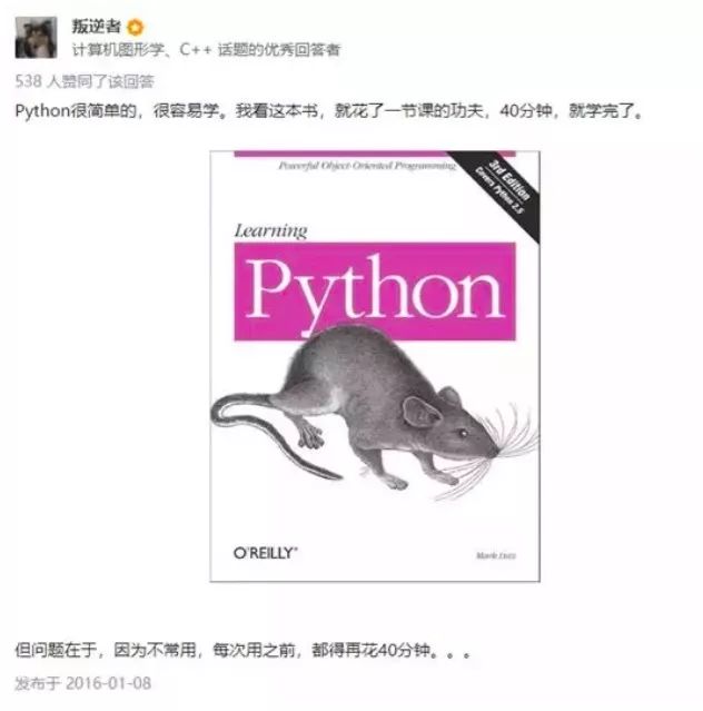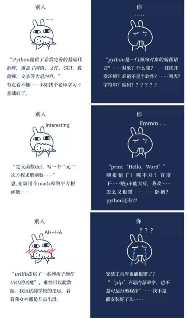 买了一本Python入门书,翻看了20页;收集了20G Python练习资料,保存在硬盘里;看了一些视频跟着写了会,突然就开始看剧了,导致放弃。这些情况是初学者很容易碰到的,学习是反人类的,Python学习更是一项前期很枯燥的行为。