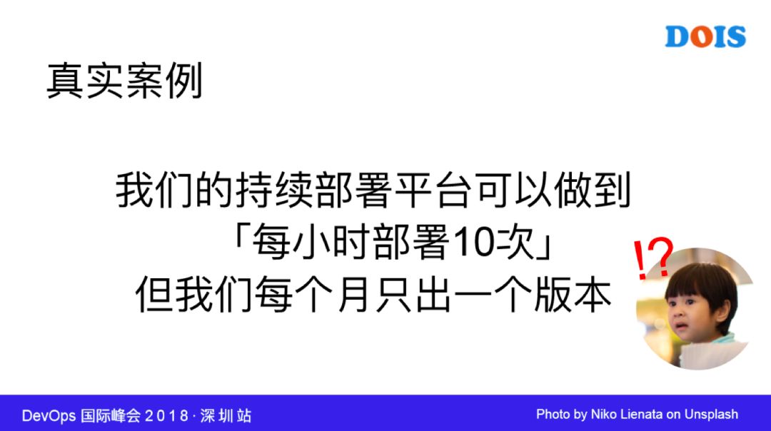 再谈另外一个案例,这来自社区里面的反馈,他们真的做了一些很棒的自动化平台,可以做到每小时部署10次,但他们的研发部门每个月只出一个版本。