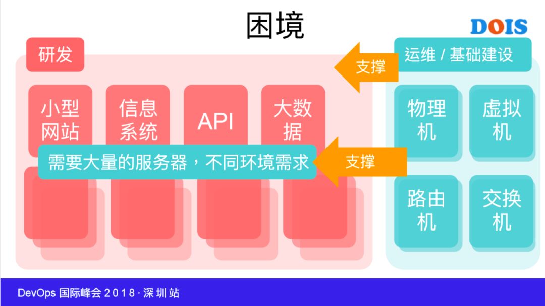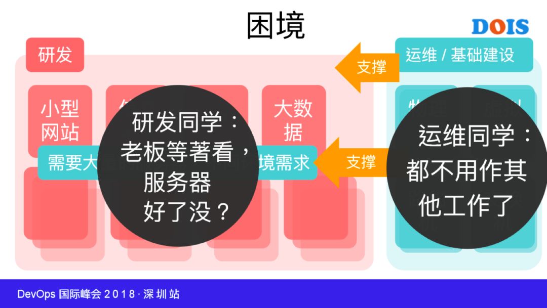 对研发而言,研发就是不断的根据新的项目需要新的环境、新的服务器,同时因为研发执行的项目类型多种,每种对环境需求都不一样,研发同学常常就会对运维同学说,老板等着看,服务器好了没?运维同学就会说,光是支撑你们,我们都不用做其他工作了。