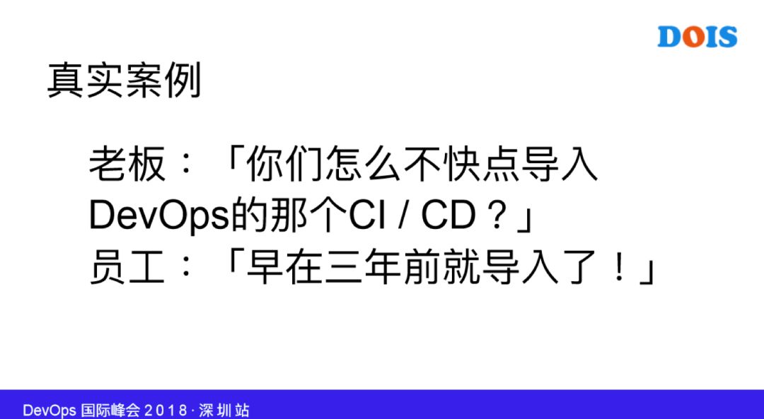 我们简单讲一个案例,曾经听过有老板这么说“你们怎么不快点导入 DevOps 的那个CI/CD?”这是满常见的误解状况,老板觉得这是新的东西,或者觉得里面的东西非常的重要,但是其实不知道工程单位早就已经在做这样的事情了。