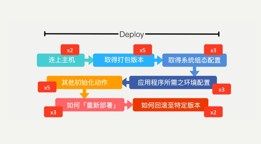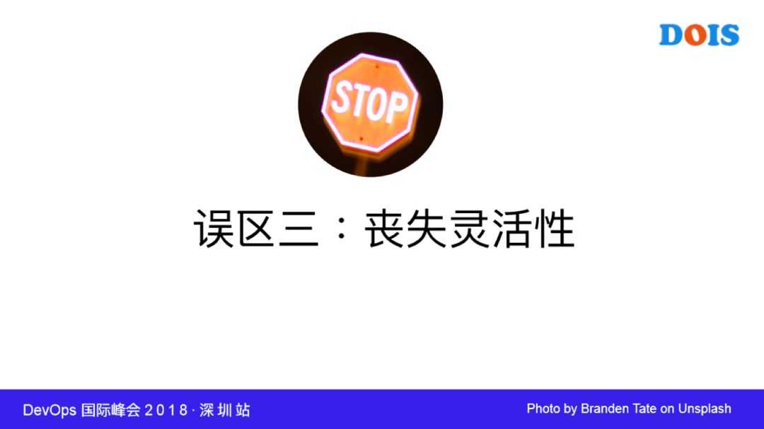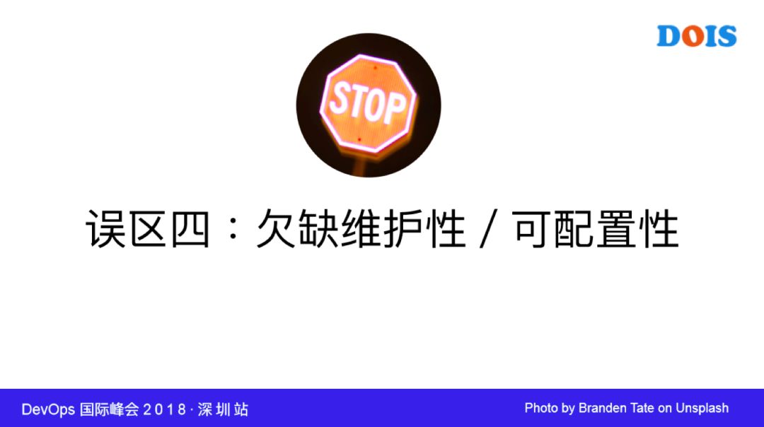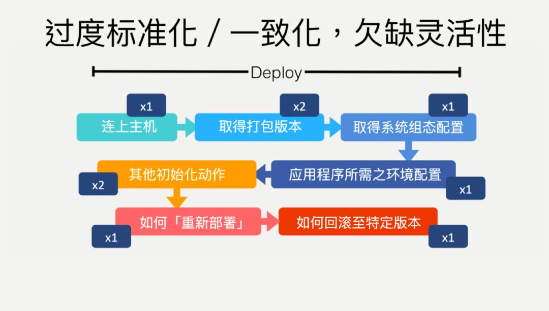 误区还有就是丧失灵活性,假设这是一个简单部署的流程,有非常多的环节可能需要思考的,要连上主机,取得打包版本,取得系统组态配置,一些环境初始化的动作,应用程序所需之环境配制,如何重新部署,如何回滚至特定版本,这个步骤可不可以重新部署,这些叠加起来是非常复杂的状况,在做自动化平台的时候,要先做标准化,甚至要先做规范化,标准化规范化之后很多东西都被固定下来了,所以丧失了很多灵活性。