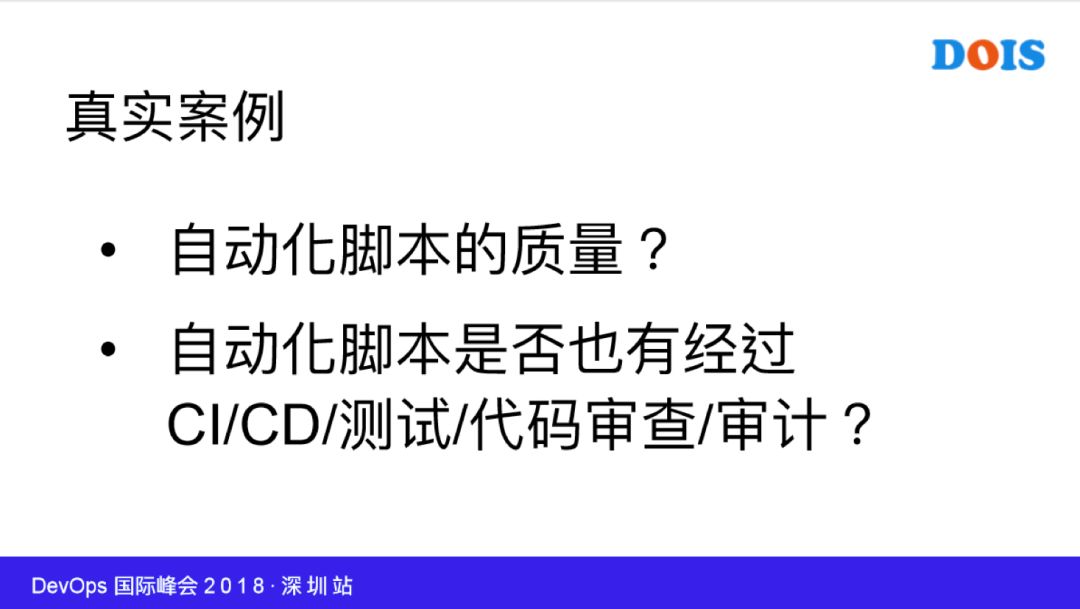 自动化非常需要持续的维护,持续的运维,自动化脚本的质量是什么?前面也提到了,脚本有没有做测试、代码审查和持续部署。