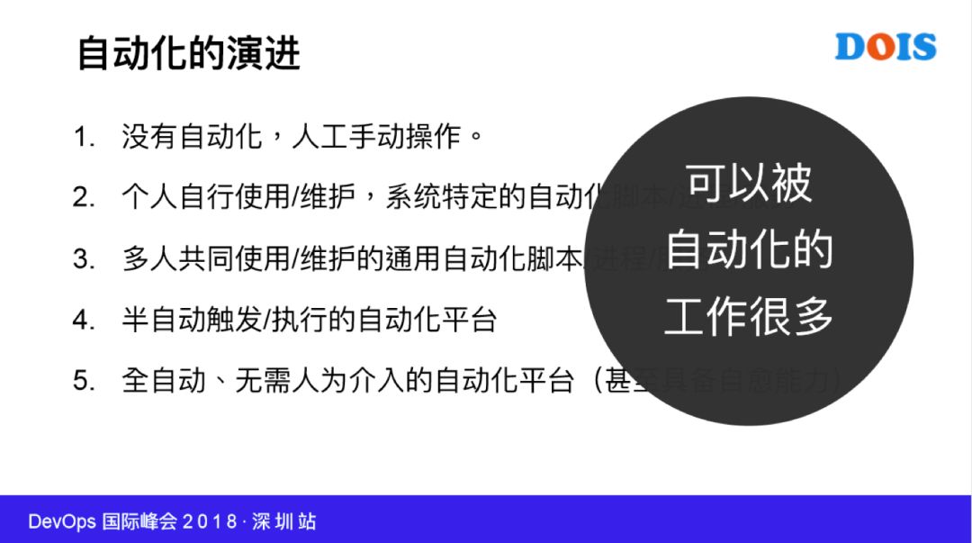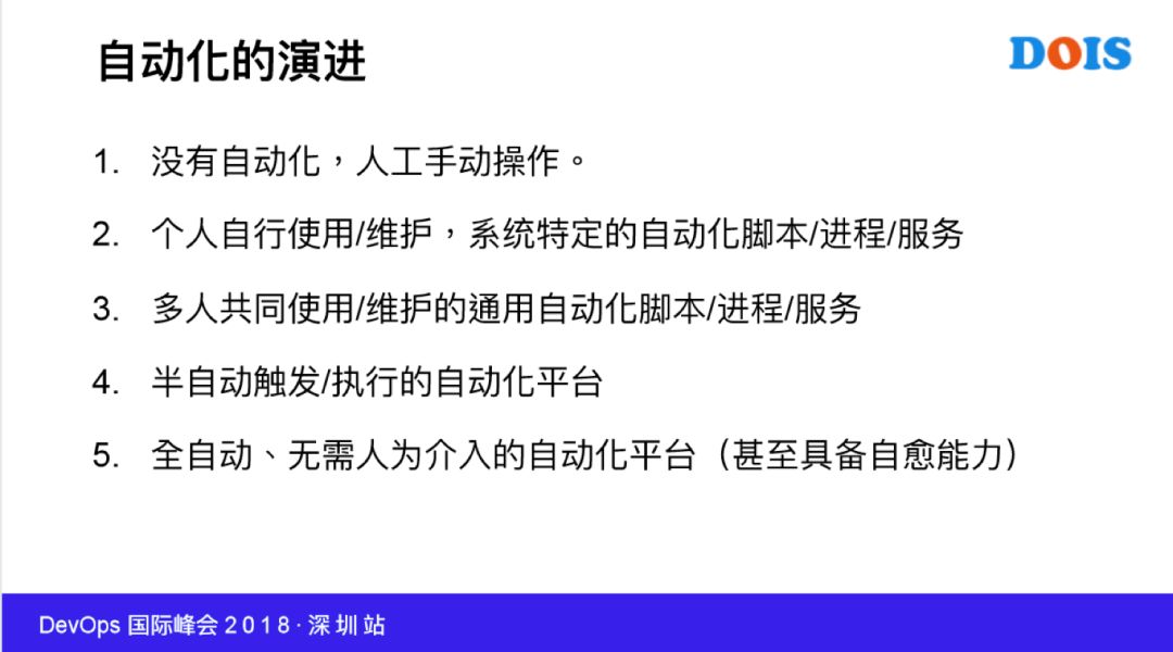 这里快速谈一下自动化的演进,最开始是没有自动化的,都是人工手动操作,后来慢慢工程师个人自行使用和维护,系统特定的自动化脚本、进程、服务,可能只是简单的脚本用来启动某一个程序。