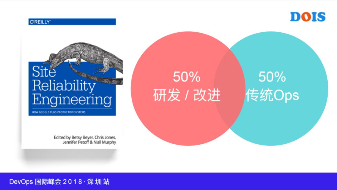 以谷歌的 SRE 为例子说明,SRE有 50% 的工作时间是做传统运维的工作,但有另外一半时间是做研发工作,不断的在做改善、改进的工作,也就是说为了维护大量的自动化工具或平台,为了维持这个自动化平台的维护性,或者说维持它的可靠性,你必须投入更多的软件工程的能力与编程的时间。