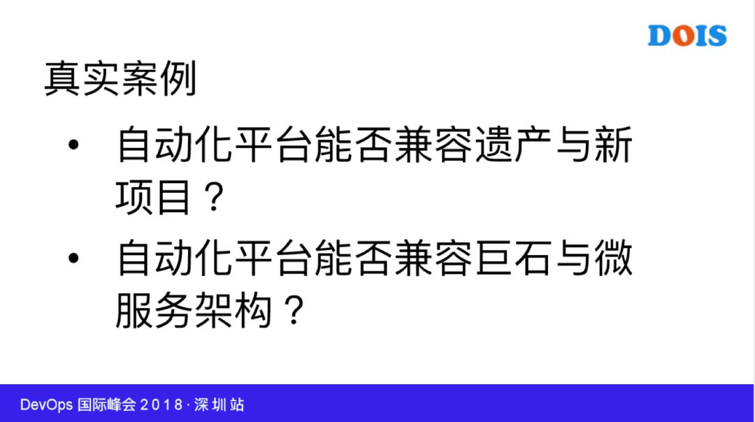 现在来看看这个案例,自动化平台能否兼容遗产与新的项目,自动化平台能否兼容巨石架构跟现在很火的微服务架构,或者这个自动化只能适用新项目,旧项目依然要人工处理,或者这个自动化只能帮你解决新的问题,旧的问题就不管了,这也是我们实际上曾遇到的问题。