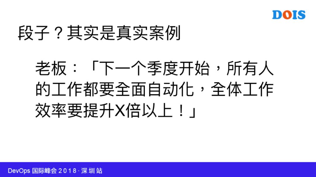 在这种状况下前面这个段子真的就会出现,而且会非常惨,老板会要求你不只做两倍,而是要五倍或者十倍。他只想看到你的成效,而不会认为 DevOps 不只是一种工具,是影响组织全面的组织变革。