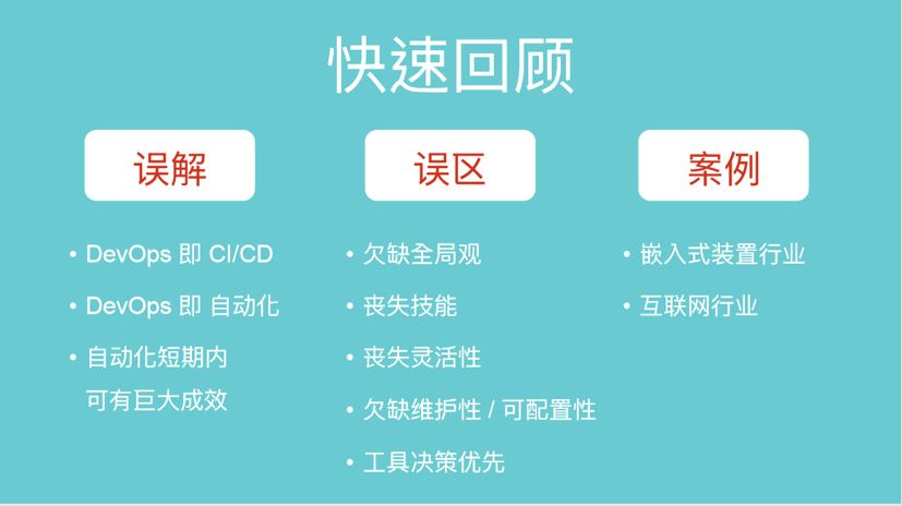 快速回顾一下今天讲的东西,我们有提到三个误解,DevOps 即 CI/CD,DevOps 即自动化,自动化短期内可有巨大的成效。还有误区,就是欠缺全局观的问题,还有就是技能丧失的问题,丧失灵活性的问题,欠缺维护性和可配制性。