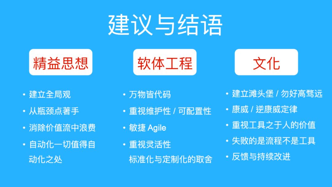 最后要注意架构,重视灵活性,注意标准化与定制化的取舍。还有就是文化,先建立滩头堡逐步前进,不要好高骛远想要一步登天。