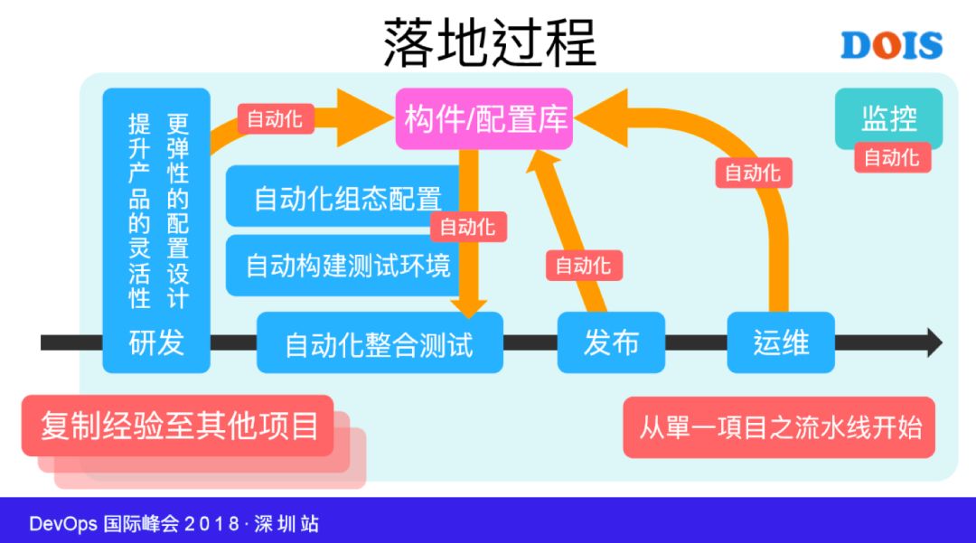 而他们的落地过程是这样子的,首先挑了其中一个项目开始,从流水线改进,第一个改进和他们构件和配置有关,从建立共用配置库开始,然后从自动化发布入手,之后发布就是统一集中送进构件库。