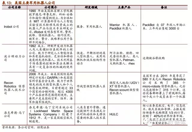 (五)军事机器人是21世纪各国军事安全重点战略:蒂尔集团称未来10年全球无人机研发投入和采购需求将达到940亿美元。军用机器人强国包括美德英法意以日韩,这些国家不仅在技术处于研究的先列,其产品已经在军事上有了实际运用;我国与这些强国的技术差距明显,受政策支持,军事机器人相关企业发展前景明显良好,可能成为企业未来强劲的收入保证。
