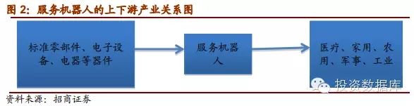服务机器人行业生产所用的主要零部件为自动焊机、电子器件、微处理器、机器人用伺服电机、高精度减速器、机加件、气动元器件、传感器、电池、单板机等,归属于标准零部件、电子设备以及电子元器件等。服务机器人产业的下游则主要是医疗、家用、农用、军事等行业和领域。