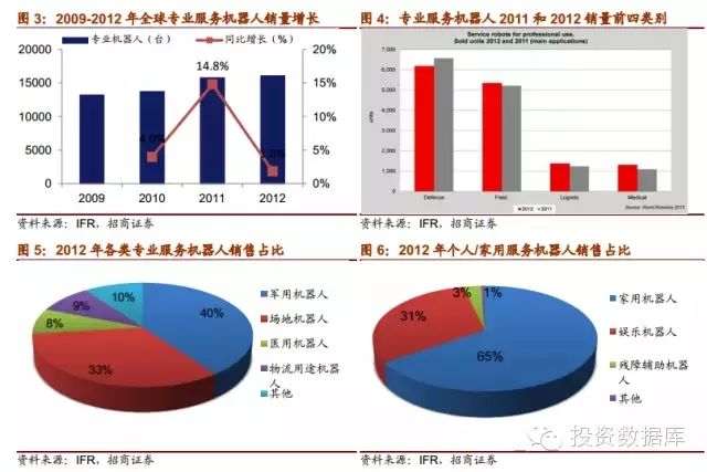专业服务机器人:1998年至今,专业服务机器人累计销量已超过12.6万台。专业服务机器人2012年总销量为16067台,比2011年的15776台增长了2%,而2012年销售额为34.2亿美元,环比略降1%。其中军用机器人销量为6200台,约占总销量40%;场地机器人销量为5300台,占销量比例33%;医用机器人销量1308台,环比上升20%,占总销量8%;物流用途机器人1376台,环比上升11%,占专业服务机器人总量比例9%,销售额为1.96亿美元。在专业服务机器人中,医用和物流用途机器人是增长潜力较大的两类专业服务机器人。