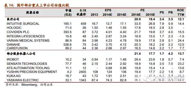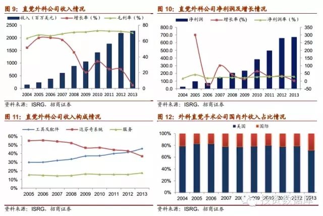 直觉外科公司是全球领先的微创机器人辅助手术机器人公司,2013年营收达22.65亿美元,截止2014年第一季度达芬奇机器人累计销售数量为3039台,2014年8月总市值达159.60亿美元。