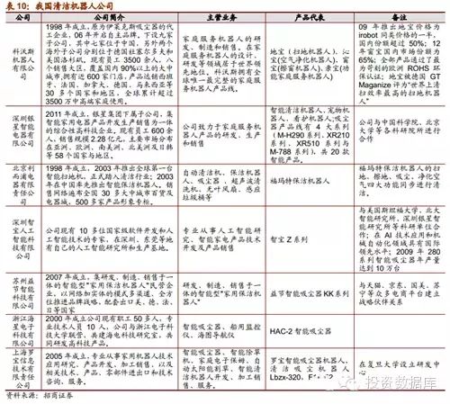 根据中国品牌网统计公布的2013年十大扫地机器人品牌排行榜,我国国产扫地机器人有6家上榜。目前为止,我国已经有一部分表现优良的企业涉足家用清洁机器人的开发和生产,都和国内高校研发机构有所合作,做到研产结合。当前机器人行业发展的宏观前景良好,市场潜力巨大,目前我国会在未来出现一批在细分行业技术领先表现良好的潜力企业。