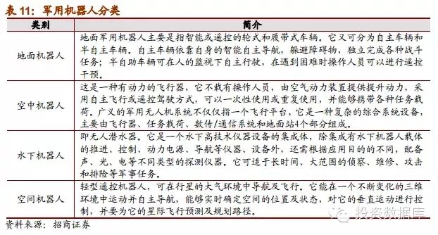 按照使用环境和军事用途来分类,军事机器人大分类:地面军用机器人、空中机器人、水下机器人和空间机器人。