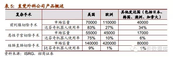 目前,直觉外科公司在复杂的外科手术中机器人应用技术娴熟,美国的达芬奇机器人渗透率和使用率相对于其他地区和国家明显更高,随着更多国家对医疗机器的需求提高和直觉外科公司在国际市场的营销推进,达芬奇机器人的市场潜力巨大。