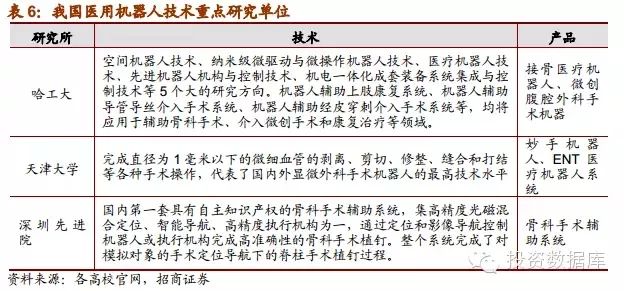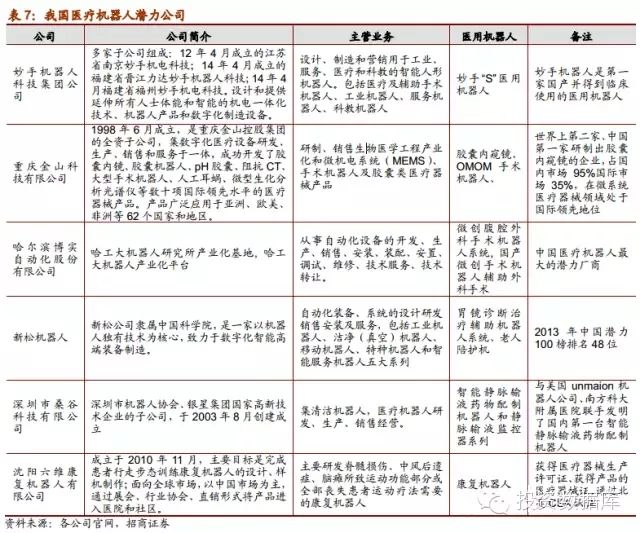 随着医用机器人技术的不断突破和发展,从2005年开始我国有一批重点高校科研医院单位及研究所在研究医用机器人系统并取得了一些小成就,比如哈工大的微创腹腔外科手术机器已经成功被专家验收,天津大学的妙手机器人在今年3月份开始临床使用;同时,随着医用机器人商业化市场化的可能性愈发明晰,已经有部分企业正在生产或者打算进军医用机器人细分行业,其中就包括机器人领先企业的博实股份和新松机器人。