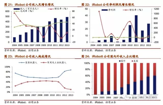 iRobot是家居清洁机器人的领先企业,产品战略布局以家居清洁机器人为主。2014年上半年实现营收2.54亿美元,2013年收入达4.87亿美元,全球市场占有率超过60%,2014年8月总市值为10.10亿美元。