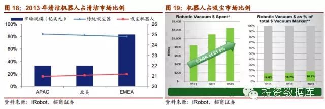 扫地机器市场具有巨大的潜力,增长势头强劲。13年家庭扫地机器人市场规模大于12亿美元,过去三年复合增长率达21.8%。扫地机器人对传统扫地设备的替代率不断提高,13年占扫地设备市场18.1%。