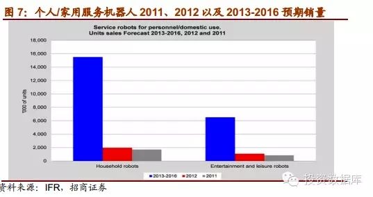 IFR报告预期,从2013年到2016年,全球工业机器人市场将以年均6%的速度增长,中国是这一增长趋势的领跑者,年均增长率达15%。根据marketsandmarkets的报告,2011年全球服务机器人市场规模为183.9亿美元,到2012年增长到207.3亿美元,计2012-2017年全球服务机器人市场规模复合增速将达到17.4%,到2017年达到461.8亿美元。对于专业服务机器,IFR预测2013-2016年估计有94800台专业服务机器人会得到安装使用,销售额达171亿美元。其中军用机器人销量约达28000台;场地机器人中的挤奶机器人销量估计为24500台。两者占总专业服务机器人销量55%。