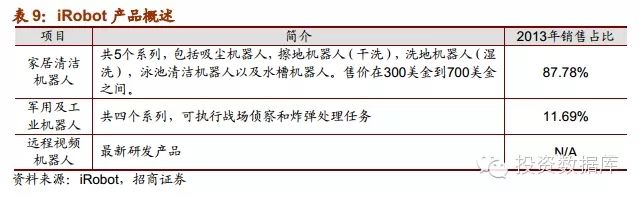 iRobot主要生产机器人,分两大系列,家居清洁机器人和军用及工业机器人。家居清洁机器人目前以扫地和拖地机器为主,军用及工业机器人主要执行战场侦察和炸弹处理任务。目前2014年新研发了远程视频机器人,未来几年会着重发展远程视频屏幕及家居维护系列。