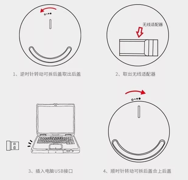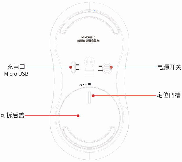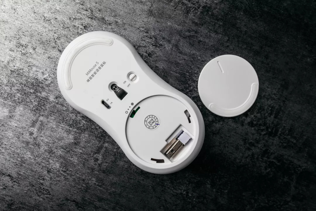 充电口下方的小圆片是存放鼠标信号发射器的位置,把发射器插到电脑上,可以作为普通鼠标直接使用,下载语音插件后,就可以使用语音功能了。