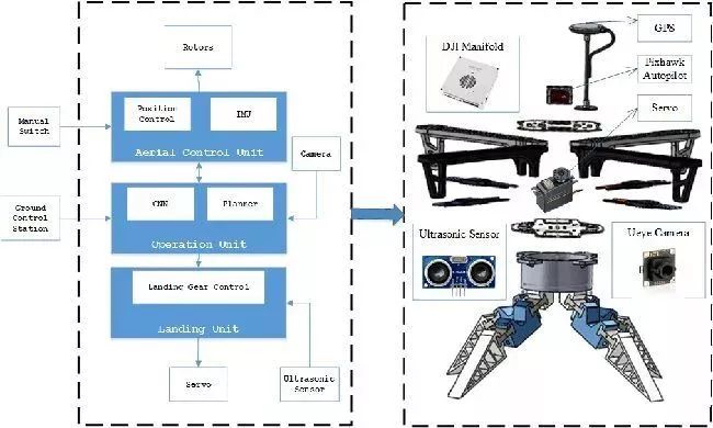 针对上述无人机着陆时的关键问题,机电工程学院同信息与控制工程学院跨学科研究团队通过微电子、计算机视觉、机械仿生学以及信号处理等学科交叉,以视觉环境感知建模技术为核心,通过理论模拟计算和实验测试相结合,设计针对非结构化地形下着陆的缓冲仿生夹持系统。该爪式着陆系统有别于传统的降落伞回收、空中回收、起落架滑轮着陆、拦截网回收和气垫着陆等无人机回收方法,使无人机能够在大坡度斜面、树枝、电线杆和横梁等非结构化地形下实现安全机降;利用基于神经网络的自适应控制,研究在强紊流、低高度情况下无人机稳定运动的控制算法,实现稳定、定点、安全着陆。