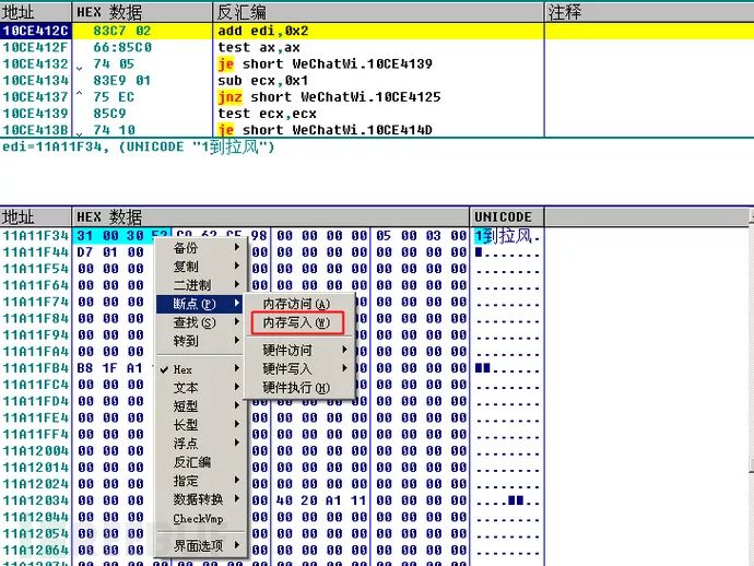 断点设置完成后,测试发送文字消息,OD断住,代码窗口显示的就是修改MsgAddr的代码位置,如上图10CE412C处。