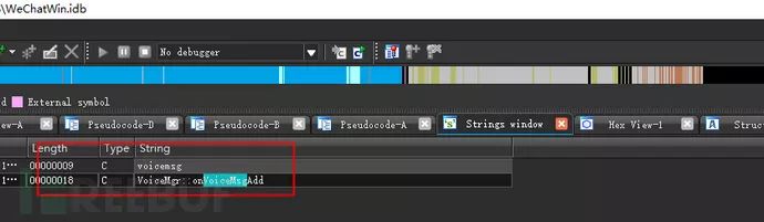 用IDA打开Wechatwin.dll,shift+F12分析出所有字符串,Ctrl+F找到关键字voicemsg,看来有戏。