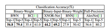 与ALexNet相比,BWN网络能够达到精度基本不变甚至略好,XNOR-Net由于对输入也做了二值化,性能稍降。