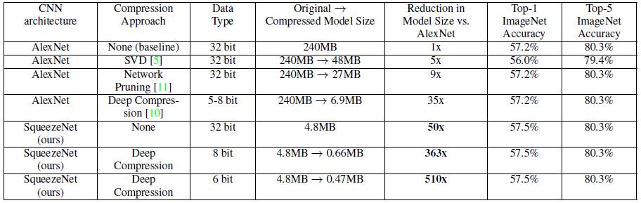 上表显示,相比传统的压缩方法,SqueezeNet能在保证精度不损(甚至略有提升)的情况下,达到最大的压缩率,将原始AlexNet从240MB压缩至4.8MB,而结合Deep Compression后更能达到0.47MB,完全满足了移动端的部署和低带宽网络的传输。