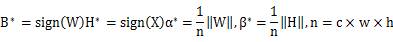 即最优的二值化滤波器张量B即为原始参数的符号函数,最优的尺度因子为每个滤波器权值的绝对值的均值。
