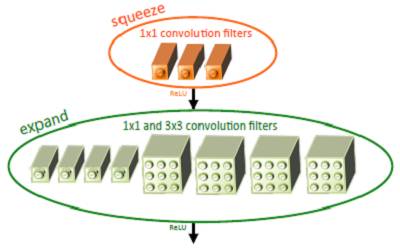 基于以上三个策略,作者提出了一个类似inception的网络单元结构,取名为fire module。一个fire module 包含一个squeeze 卷积层(只包含1x1卷积核)和一个expand卷积层(包含1x1和3x3卷积核)。其中,squeeze层借鉴了inception的思想,利用1x1卷积核来降低输入到expand层中3x3卷积核的输入通道数。如图1所示。