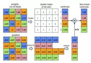 此处的权值量化基于权值聚类,将连续分布的权值离散化,从而减小需要存储的权值数量。