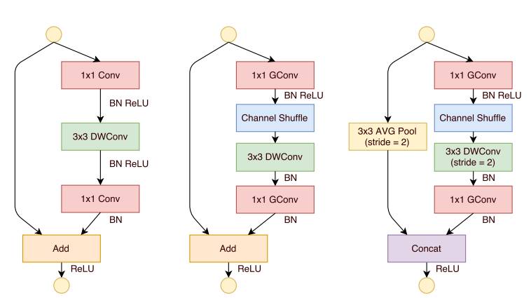 借鉴ResNet的旁路分支思想,ShuffleNet也引入了类似的网络单元。不同的是,在stride=2的单元中,用concat操作代替了add操作,用average pooling代替了1x1stride=2的卷积操作,有效地减少了计算量和参数。单元结构如图10所示。