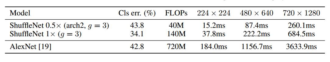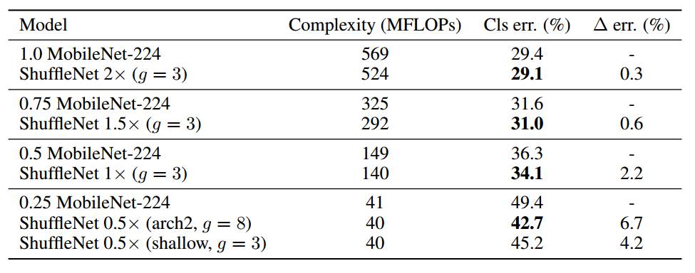 上表显示,相对于MobileNet,ShuffleNet的前向计算量不仅有效地得到了减少,而且分类错误率也有明显提升,验证了网络的可行性。