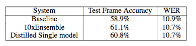 上表显示,蒸馏后的模型的精确度和单字错误率和用于产生软目标的10个模型的性能相当,小模型成功地学到了大模型的识别能力。