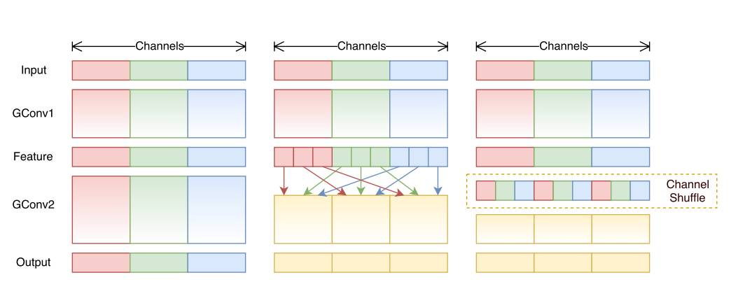 提出了核心的shuffle操作将不同group中的通道进行打散,从而保证不同输入通道之间的信息传递。