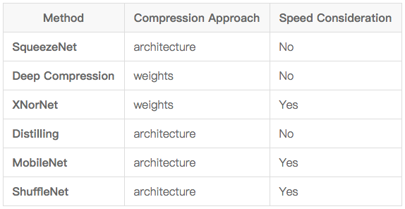 本文主要讨论如下几篇代表性的文章和方法,包括SqueezeNet[5]、Deep Compression[6]、XNorNet[7]、Distilling[8]、MobileNet[9]和ShuffleNet[10],也可按照上述方法进行大致分类: