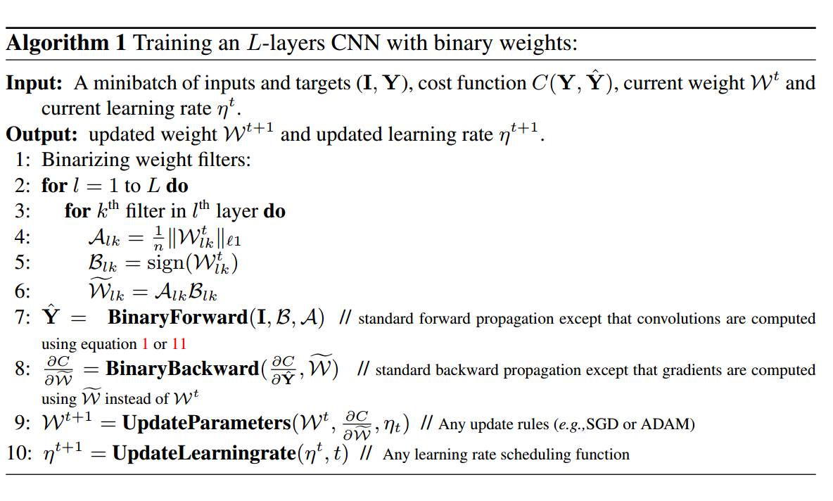 训练算法如图5所示,值得注意的是,只有在前向计算和后向传播时使用二值化后的权值,在更新参数时依然使用原始参数,这是因为如果使用二值化后的参数会导致很小的梯度下降,从而使得训练无法收敛。