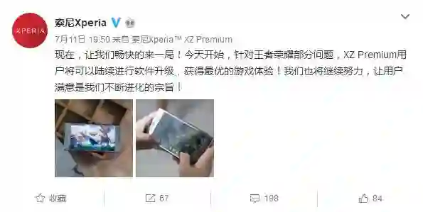 索尼官方在微博中提到,“现在,让我们畅快的来一局!今天开始,针对王者荣耀部分问题,XZ Premium用户将可以陆续进行软件升级,获得最优的游戏体验!我们也将继续努力,让用户满意是我们不断进化的宗旨。”