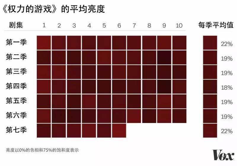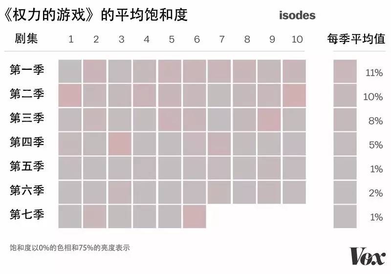 Vox网站分析了迄今为止所有66集里对色彩的使用——在剧集播出时,每隔10秒拍摄一次画面,并平均处理每张图里出现的颜色。结果发现:平均色彩是暖色的场景(也就是接近红色而非蓝色),多于冷色的场景。