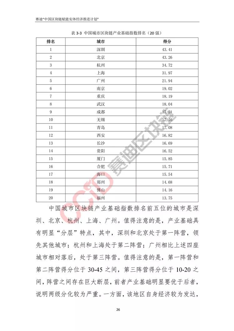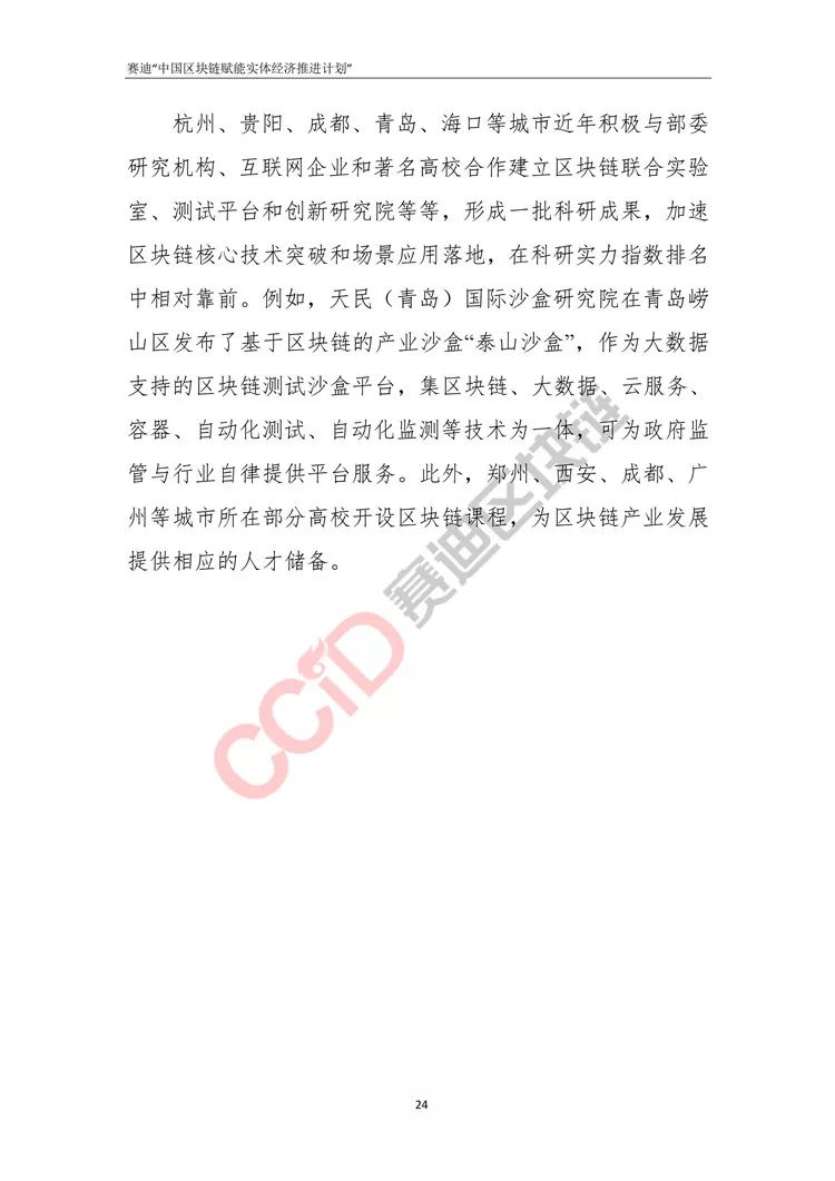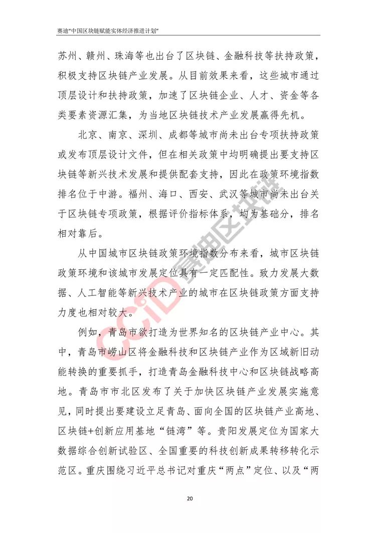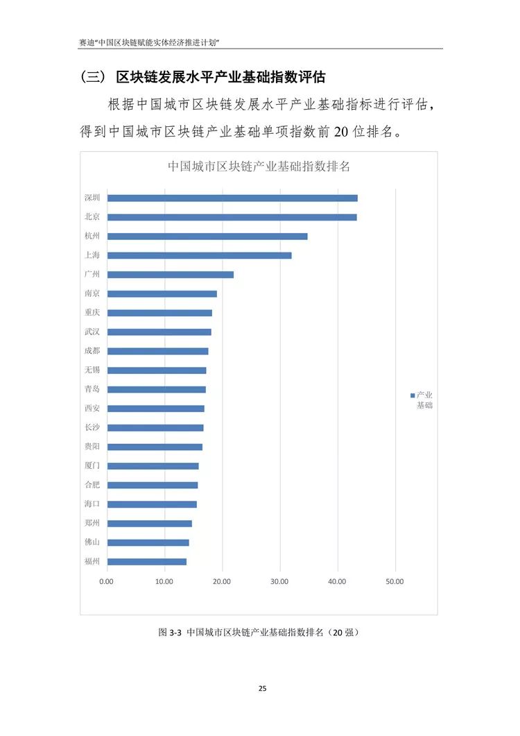 2018年12月7日,赛迪(青岛)区块链研究院发布了《中国城市区块链发展水平评估报告(2018年)》,报告从政策环境、科研实力、产业基础、资本支持四个方面对中国45座重点城市的区块链发展水平进行评估,并评选出中国城市区块链发展25强。