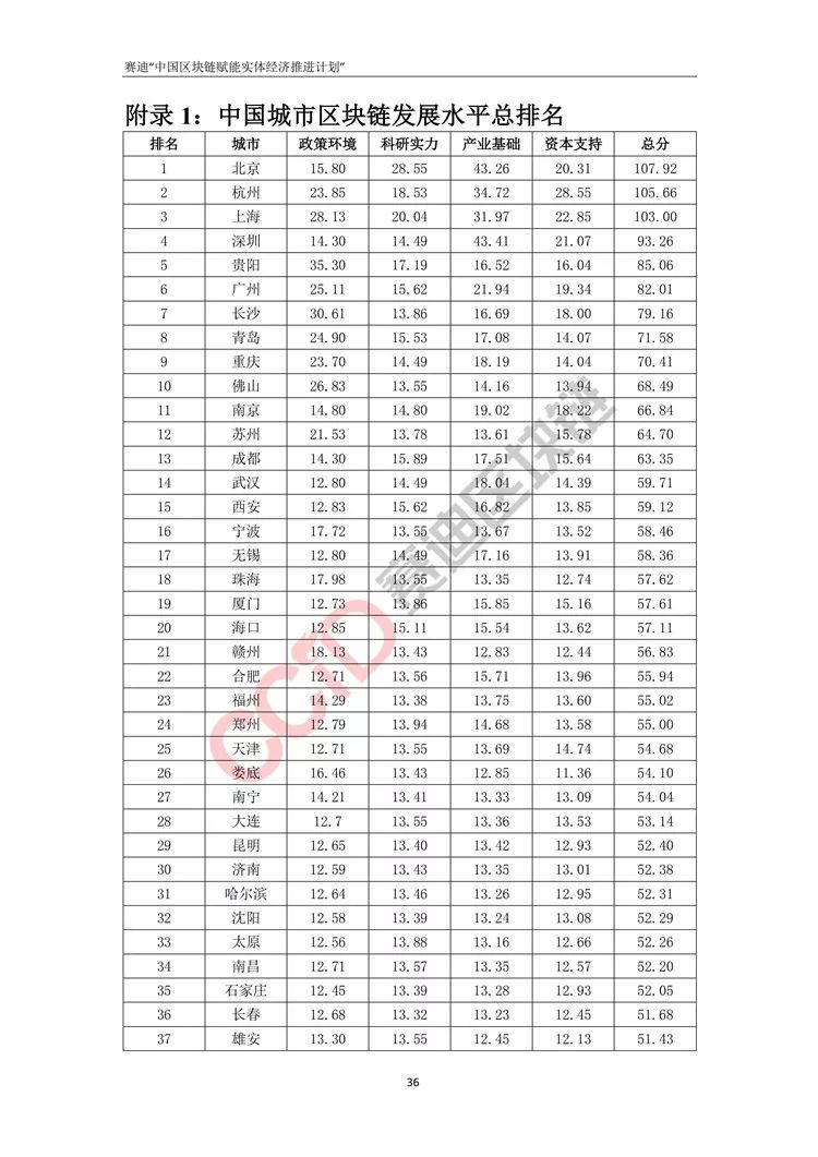 其中,北京凭借其雄厚科研实力和强大产业基础,以107.92分居于榜首,杭州、上海和深圳则分别以105.66分、103.00分、93.26分列二、三、四名。贵阳凭借其在区块链政策的重大举措和成果,位列第五名。广州、长沙、青岛、重庆和佛山则分别占第6名至第10名。