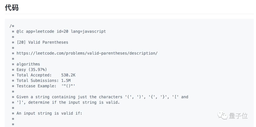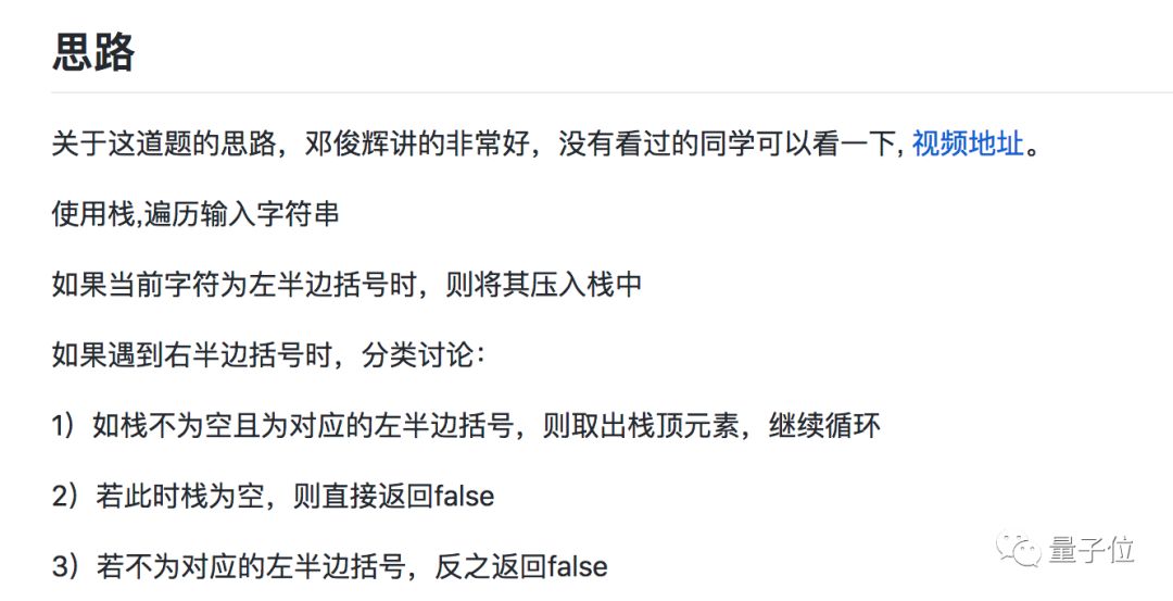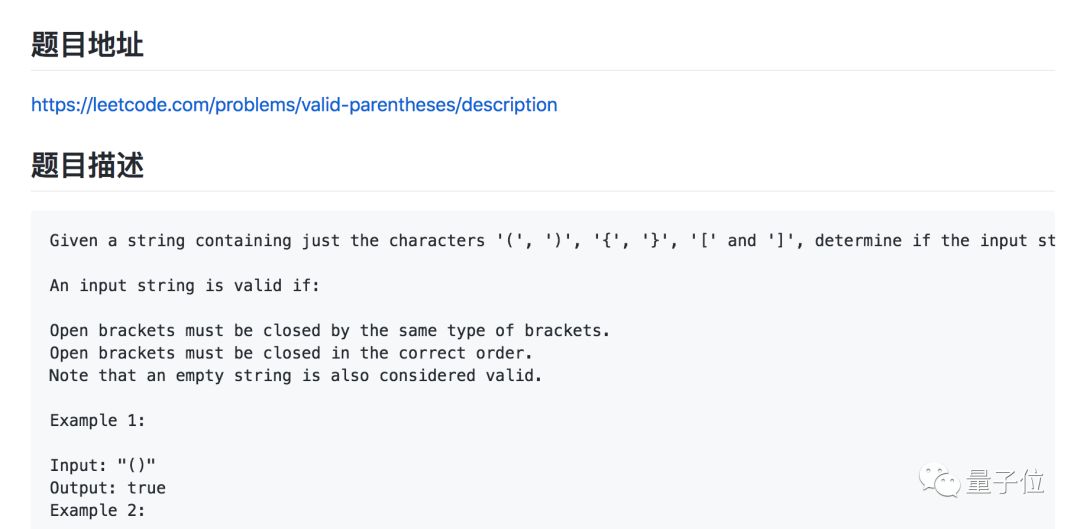 比如在第20题“有效括号”中,作者先放上了leetcode里的题目地址,贴上了题干的描述: