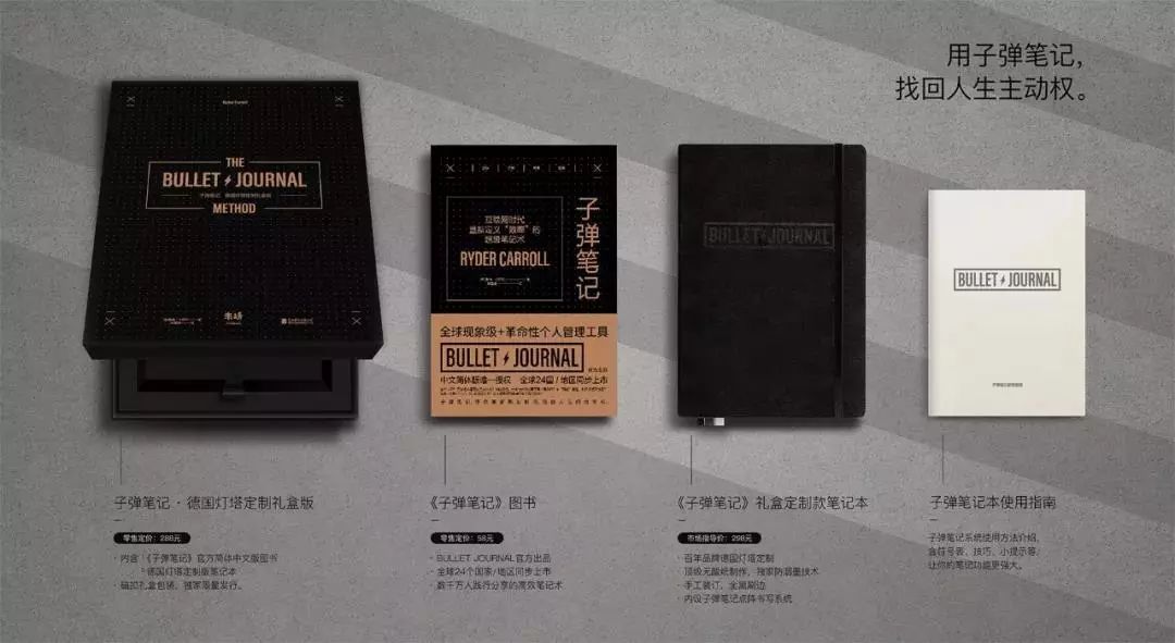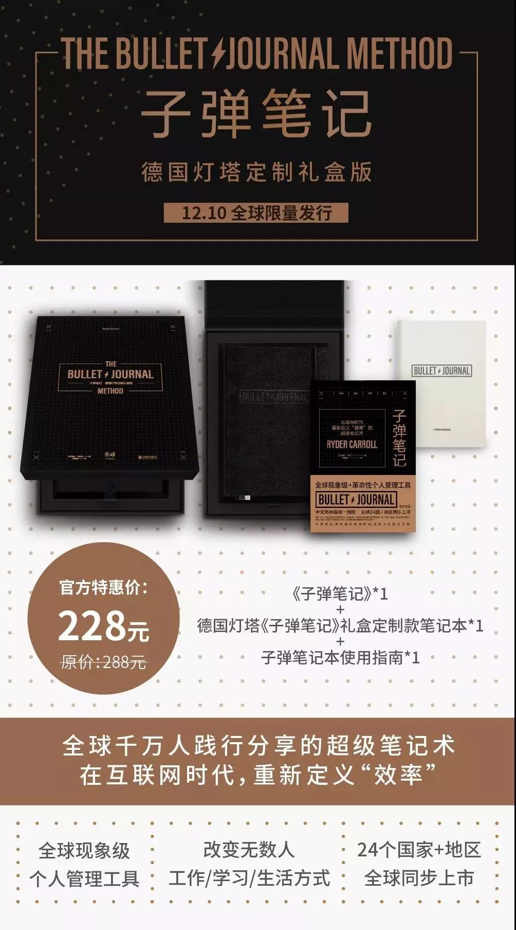 普通版灯塔子弹笔记本的官方售价最低为293元,而这套《子弹笔记》限量礼盒装,除了包含《子弹笔记》礼盒定制款笔记本外,还包含全球同步发行的《子弹笔记》中文版和子弹笔记本使用指南,仅需288元,首发购买只需228元。