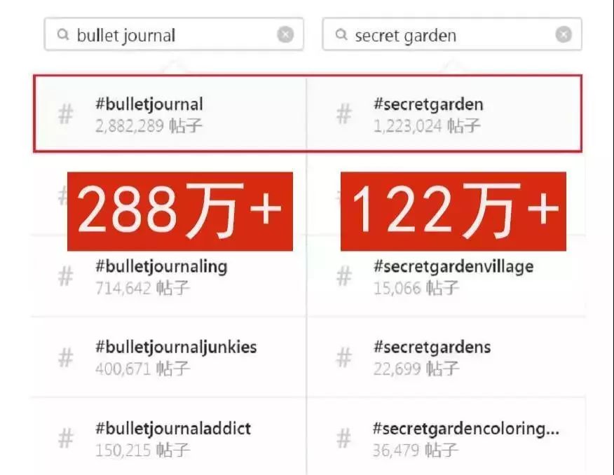 社交媒体Instagram上和“子弹笔记”有关的晒图超过288万,是“秘密花园”热度的2倍多,而且数字还在持续刷新!