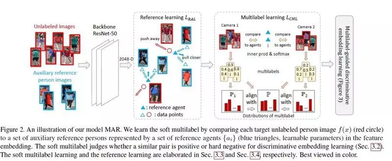 相对于有监督行人重识别(RE-ID)方法,无监督 RE-ID 因其更佳的可扩展性受到越来越多的研究关注,然而在非交叠的多相机视图下,标签对(pairwise label)的缺失导致学习鉴别性的信息仍然是非常具有挑战性的工作。为了克服这个问题,我们提出了一个用于无监督 RE-ID 的软多标签学习深度模型。该想法通过将未标注的人与辅助域里的一组已知参考者进行比较,为未标注者标记软标签(类似实值标签的似然向量)。基于视觉特征以及未标注目标对的软性标签的相似度一致性,我们提出了软多标签引导的 hard negative mining 方法去学习一种区分性嵌入表示(discriminative embedding)。由于大多数目标对来自交叉视角,我们提出了交叉视角下的软性多标签一致性学习方法,以保证不同视角下标签的一致性。为实现高效的软标签学习,引入了参考代理学习 (reference agent learning)。我们的方法在 Market-1501 和 DukeMTMC-reID 上进行了评估,显著优于当前最好的无监督 RE-ID 方法。