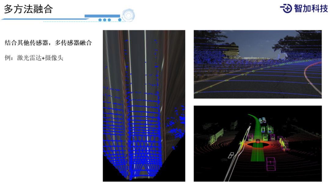 另一种更常用,更安全的方法就是激光雷达,进行多传感器融合,如将激光雷达投影到image,可以很轻松的建模出可行驶的道路和障碍物。
